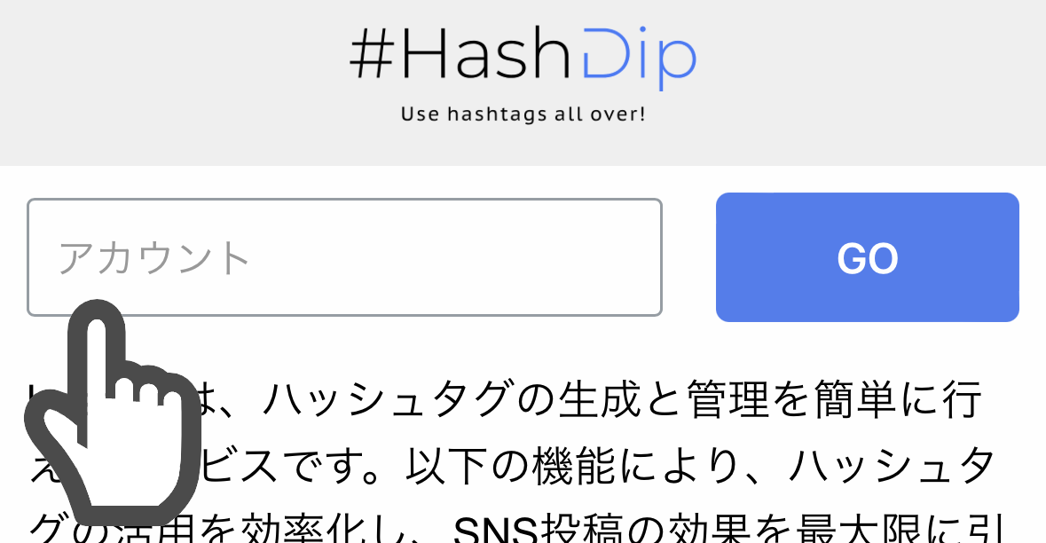 アカウントを登録すると#HashDipのワークスペースに移動します。(このページをブックマークするといつでも便利に#HashDipにアクセスできます)キーワードを入力して#ボタンを押すとハッシュタグが生成されます。入力したハッシュタグをクリックするとTwitterでの検索が行えます