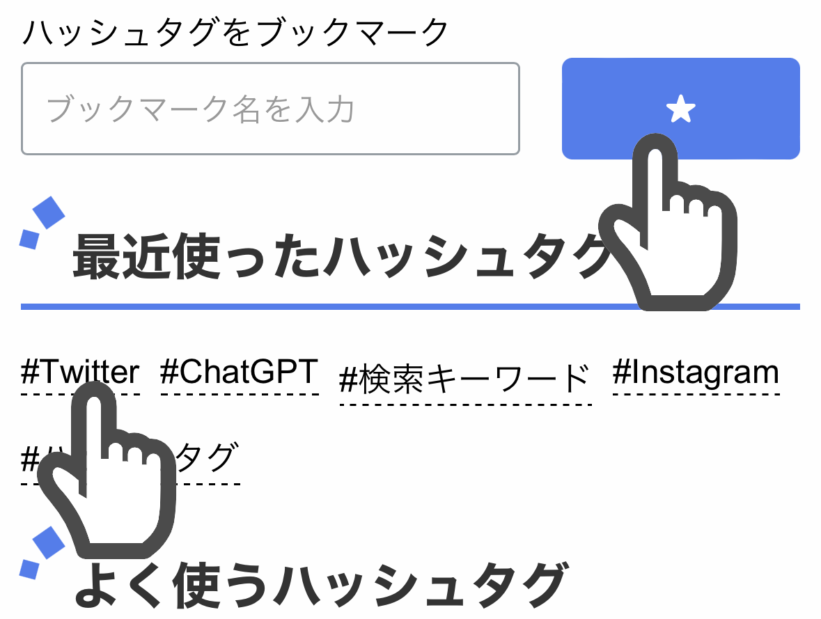 最近使ったハッシュタグ、よく使うハッシュタグは自動的に25個保存されハッシュタグをクリックすることですぐに呼び出せます。また、ハッシュタグ群は名前をつけてブックマークできます。ブックマークしたハッシュタグはいつでも呼び出すことができます